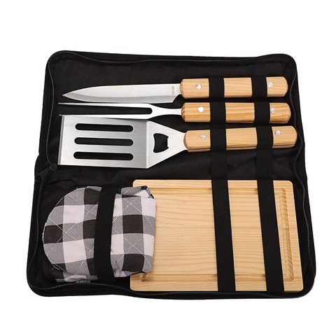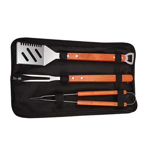 3 utensilios para parrilla de barbacoa de acero inoxidable con mango de madera en bolsa Oxford